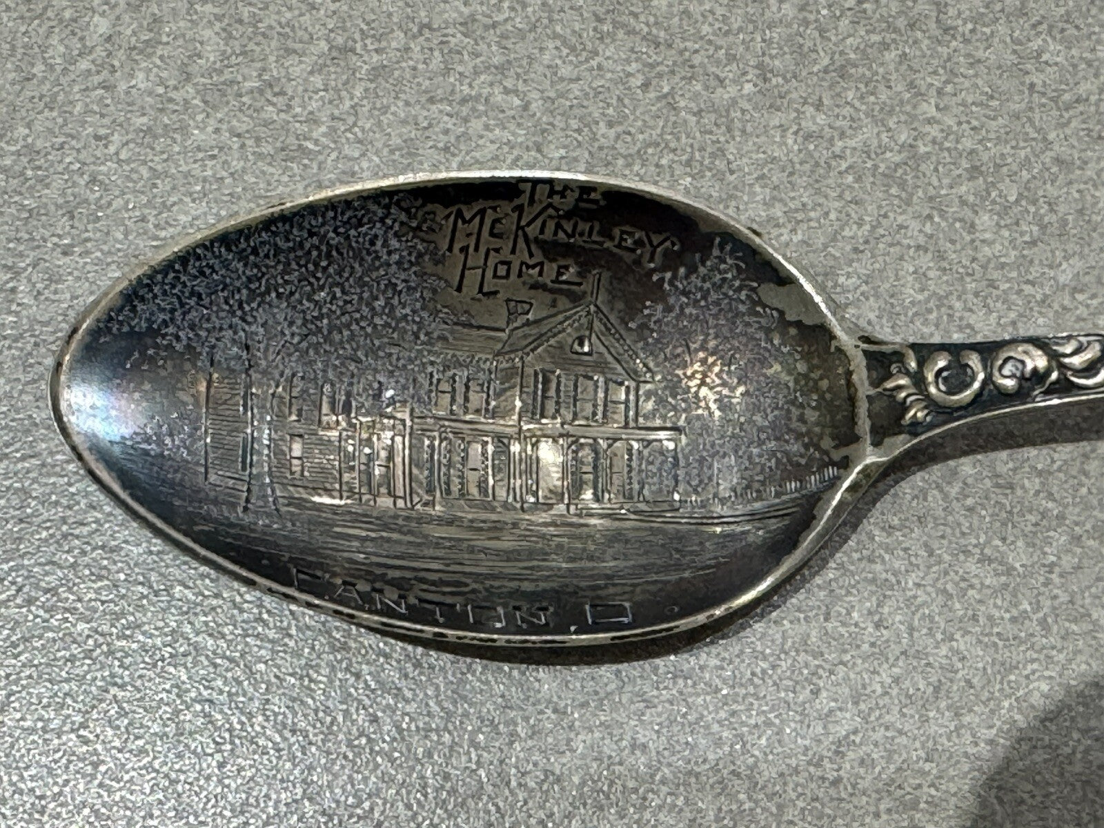 This sterling silver souvenir spoon is a beautiful addition to any collection. This spoon features the home of the 25th president of the United States William McKinley , on one side and the American eagle on the other. The spoon is 5 7/8 inches in length and weighs 22.1 grams, making it a substantial piece.